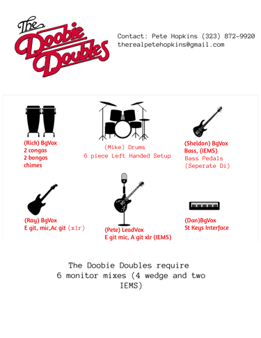 Download detailed Artist Tour Riders and Stage Plots for the Doobie Doubles. Get essential info on technical requirements, equipment, stage layout, and hospitality needs, ensuring a seamless performance.